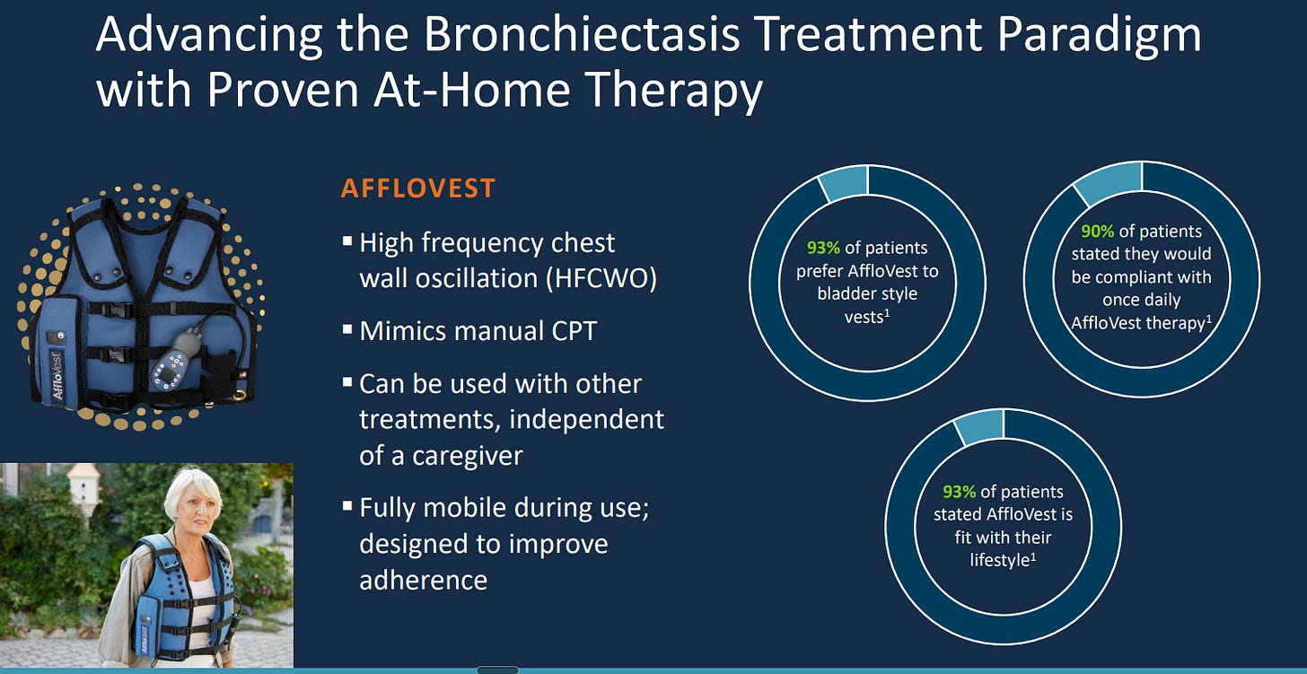 AffloVest: a portable, battery-powered high-frequency chest wall oscillation (HFCWO) vest with eight motors that loosen and mobilize mucus from the lungs. Unlike traditional compressor-based vests, AffloVest is fully wearable, allowing patients to move freely during treatment and improving the likelihood of consistent use.