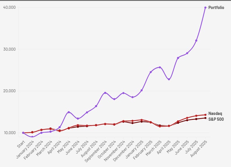 From the start of 2024 to month end August 2025, my portfolio is up 299.66%.