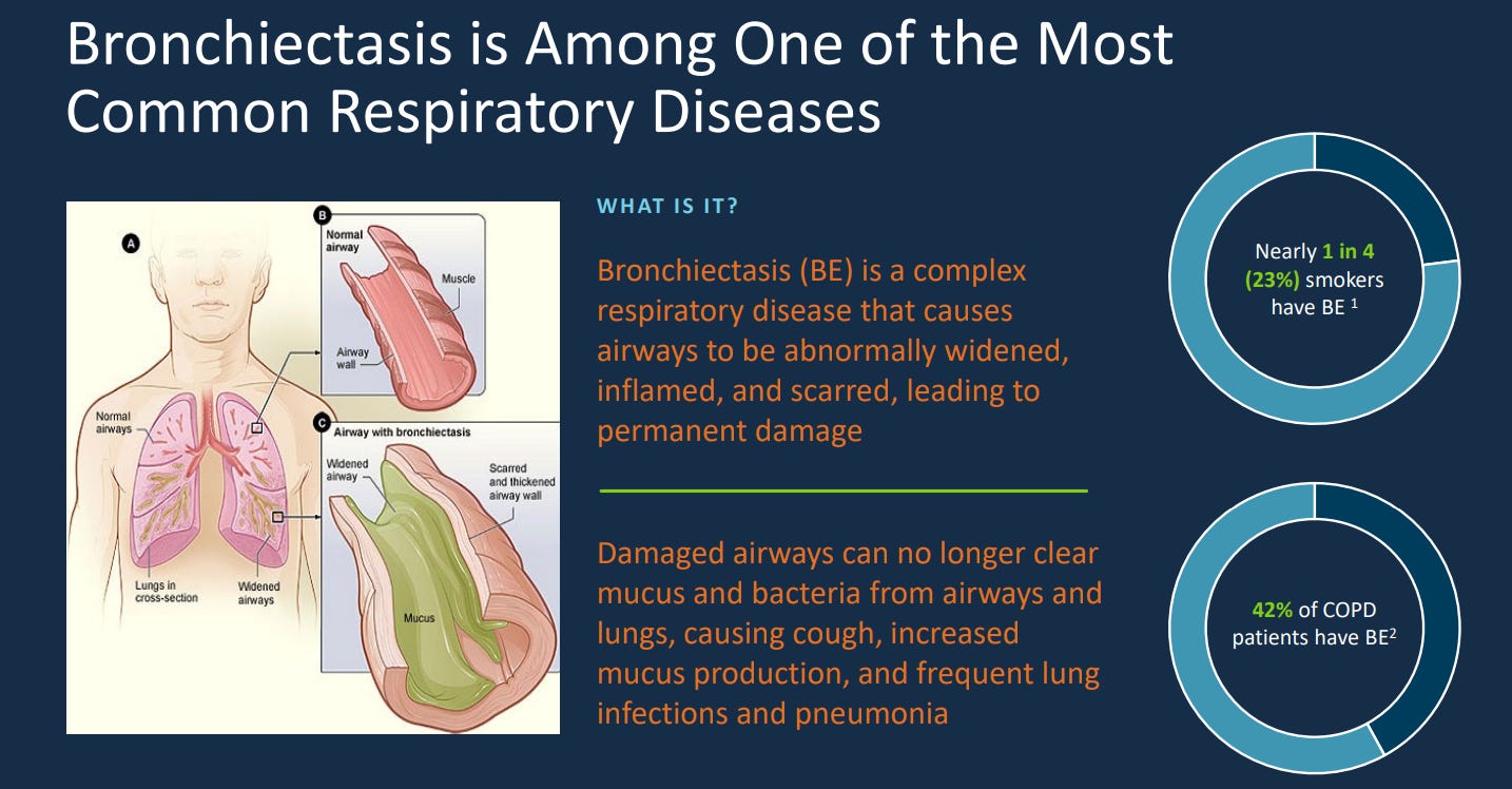Bronchiectasis is permanent widening and scarring of the airways that trap mucus, creating a cycle of infection and inflammation. Common causes are cystic fibrosis, repeated infections, and autoimmune disease.